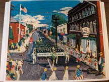Thomas “Tokey” Barnes (1928-1995) was a life-long Mansfield resident, and his paintings portrayed life as he saw it.  Those who knew him remarked about his humor, wit, and generosity.  Most of his paintings were gifted to his family and friends and can be found in Jimmy’s Pub, Stan’s Barber Shop, and Geno’s.   Tokey was born with Cerebral Palsy,  which influenced his portrayal of people in this painting of Mansfield.   Lily’s Drug Store with Mr. Vose standing in front, the old Post Office and the Mansfield High School Marching Band brings back memories of Mansfield in a different time.